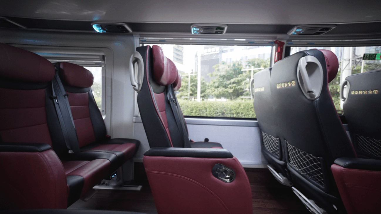 除了静音,乘车舒适度更是核心考量。此次引入的海格新V系采用12米车长的最高端车型,在此基础上,车辆还进行了诸多个性化优化与选配。最直观的便是座位配置——在12米的车身内,座位数量被控制在40-44个,相比传统大巴大幅减少,为游客提供了更宽敞的乘坐空间。同时,车上配备的均为商务座椅,可实现45度角倾斜,搭配可调节头枕,让游客在旅途中能够轻松休息,缓解疲劳。