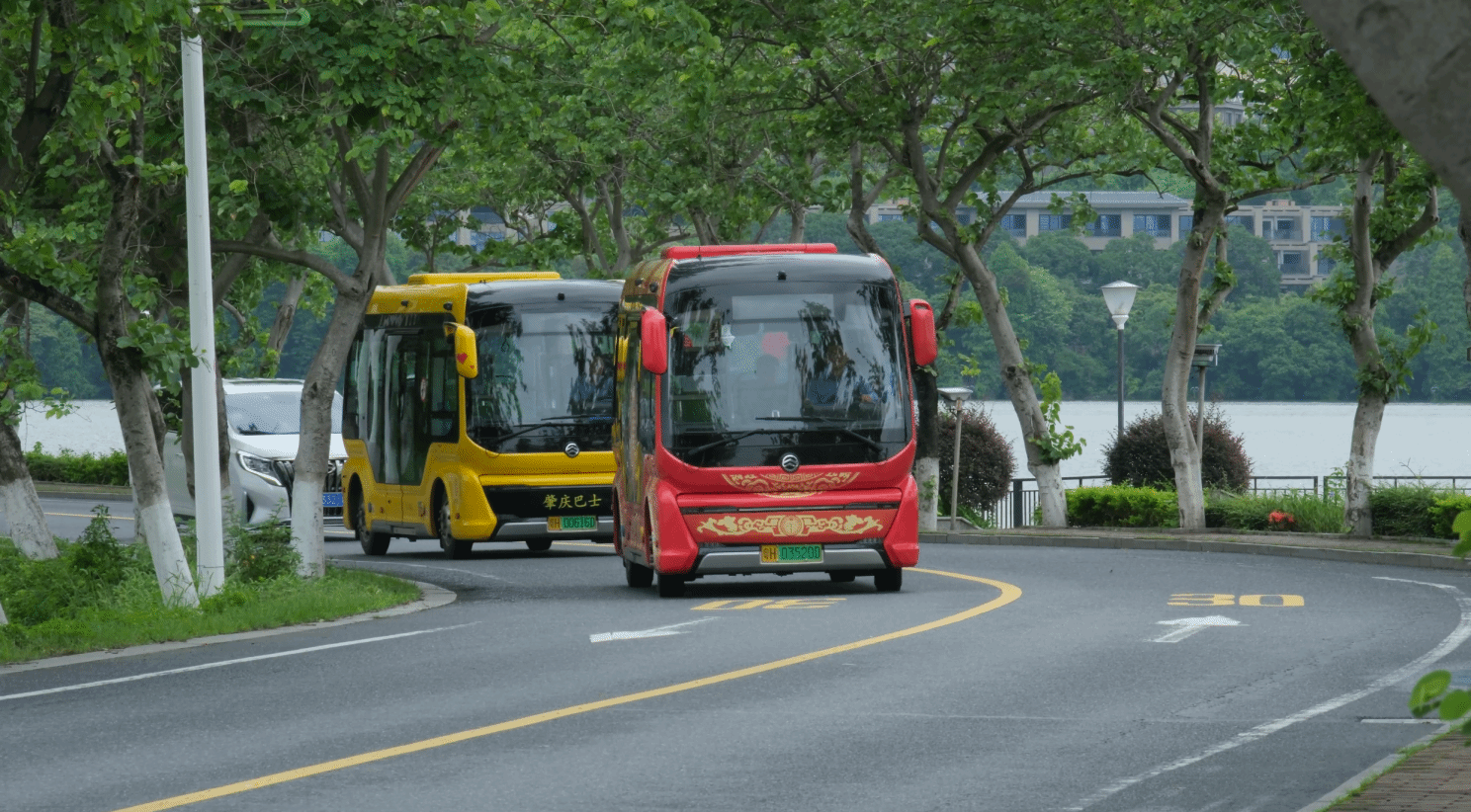 每日清晨,肇庆环星湖旅游公交专线迎来首班“宝宝巴士”。红黄橙蓝等明亮车身涂装在晨光中格外醒目,5.99米长的小巧车身轻盈在狭窄湖边道路来回穿梭,通透大视窗,湖边美景尽览无遗。