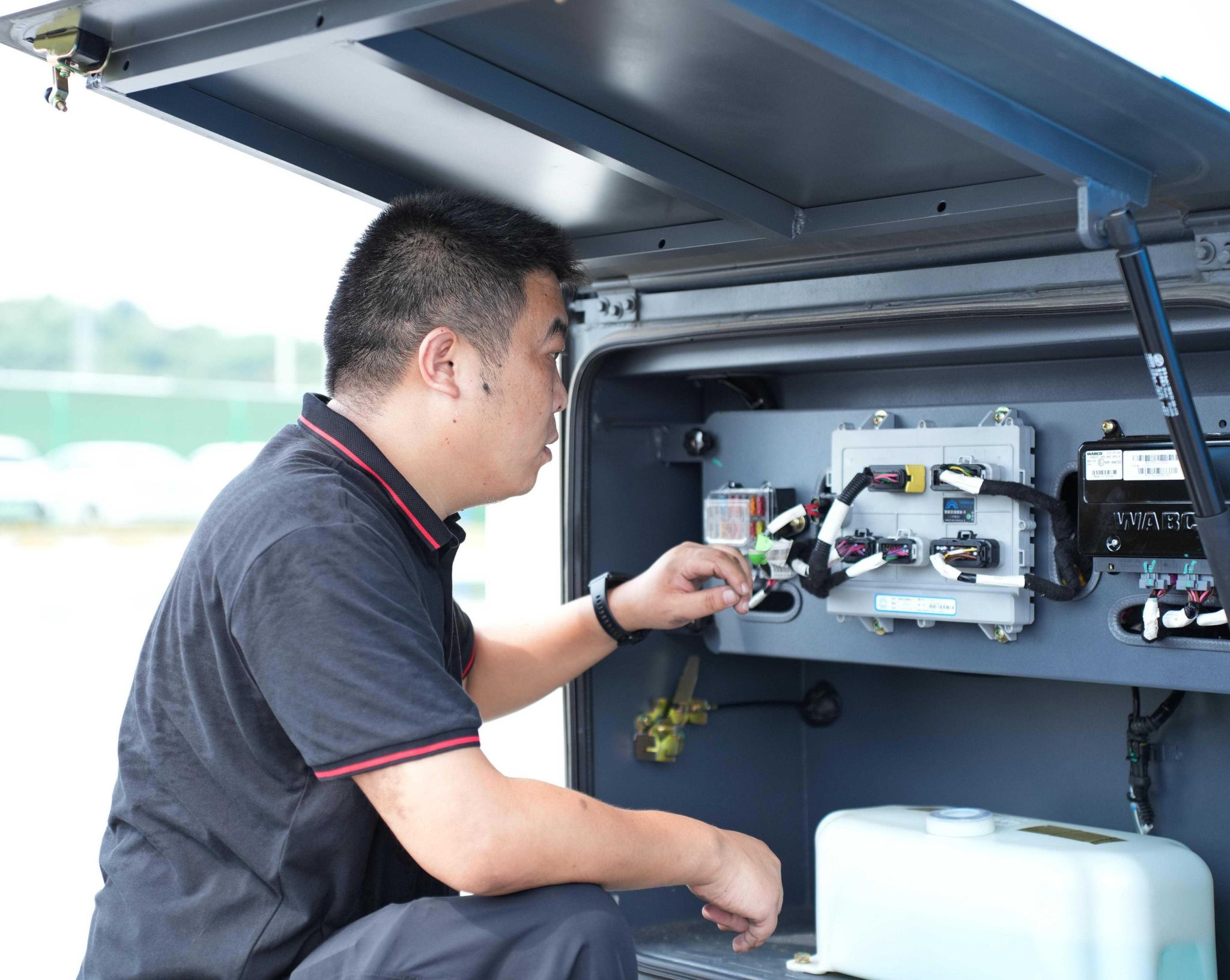 依托服务奥运会、卡塔尔世界杯等国际赛事的成熟经验,苏州金龙构建“三步走”保障体系。一是,前置协同、严苛筛选机制:与客运企业深度对接,精准匹配车型与线路需求,所有车辆经多轮检测,重点排查发动机、制动、底盘等核心部件,确保“零隐患”上岗;二是配件先行:在成都建立专用备件库,核心部件储备充足,实现“即需即供”;三是驻点护航、应急联动:自8月3日起,技术服务团队入驻组委会指定区域,24小时全天候待命,直至8月17日赛事收官,并进行动态监管,每日全车系统检查,重点部位“一车一档”跟踪。