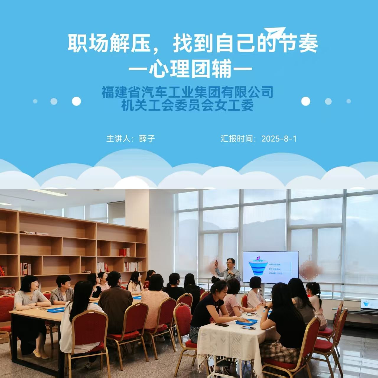 近日,福汽·欣悦空间特邀省直机关“心光大道”心理健康服务项目专家团队,为集团总部女职工开展心理健康服务活动。活动创新采用“讲座+沙盘体验”形式,聚焦职场情绪管理核心需求,助力女职工们以更从容的心态应对工作挑战,为企业发展凝聚巾帼力量。